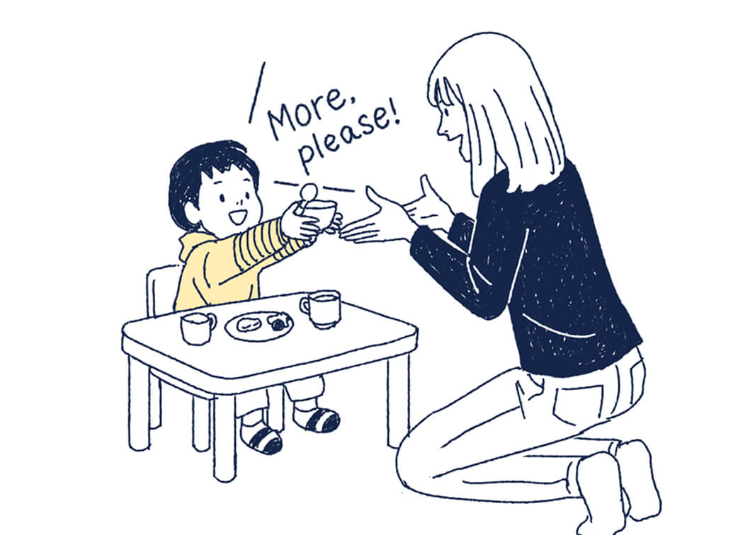 2歳は「いや!」「ほしい!」など自分の気持ちを言葉で伝え始め、その言葉が伝わったことで達成感を味わいます。英語も日本語と同じように気持ちを伝え達成感を得ることで、自然に使えるようになります。